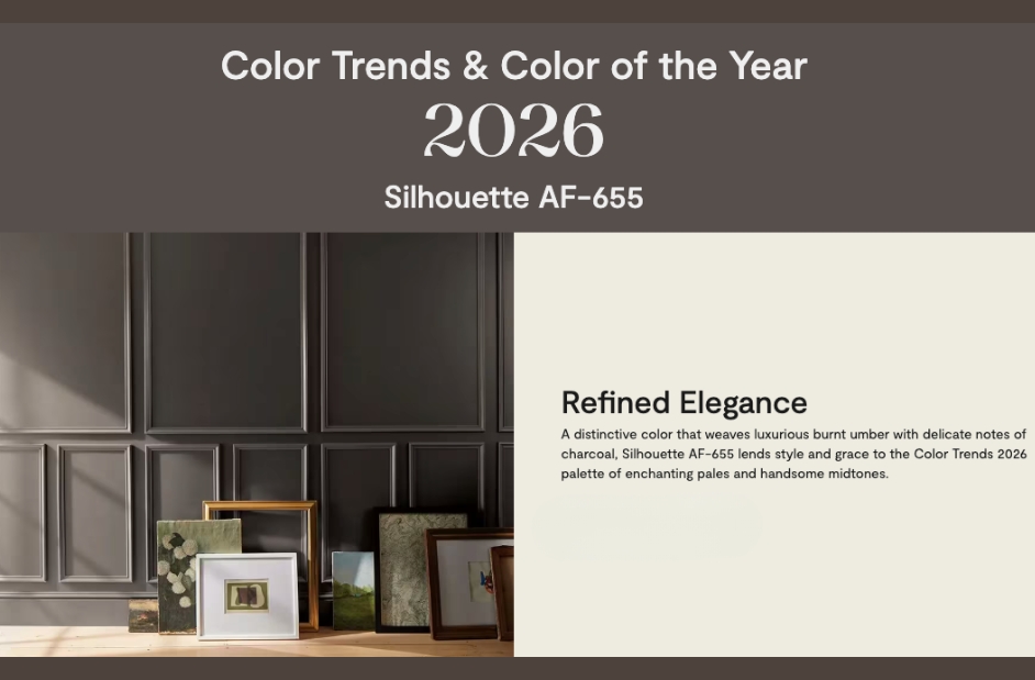 Benjamin Moore’s Silhouette AF-655 exudes modern sophistication — a moody blend of charcoal, plum, and soft brown that captures both warmth and depth. This luxurious hue creates an atmosphere of quiet confidence, perfect for homeowners seeking elegance with a contemporary edge. Silhouette’s velvety richness pairs beautifully with creamy whites, warm taupes, brass accents, and natural wood tones, making it ideal for accent walls, cozy bedrooms, or dramatic dining spaces. In California homes, it offers a refined sense of comfort — grounding interiors with style and grace while complementing the soft, golden light of the West Coast.